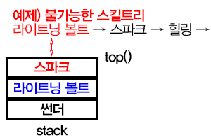 위 그림은 문제에서 예제로 주어졌던 불가능한 스킬트리다. 선행 스킬 순서가 스파크 → 라이트닝 볼트 → 썬더이므로 스택에는 뒤집어서 썬더 → 라이트닝 볼트 → 스파크의 순서로 넣는다. 스택은 먼저 넣은 것이 가장 안에 있기 때문에 스택의 가장 위에는 스파크가 있다. 이 때 입력으로 주어지는 스킬트리(여기서는 라이트닝 볼트 → 스파크 → 힐링 → 썬더) 를 앞에서부터 읽어보자. 읽기 시작하자마자 오류가 발생한다. 첫 번째 스킬 라이트닝 볼트는 분명히 선행 스킬 순서(스택)에 있는 스킬인데, 스택의 가장 위에는 스파크가 있다. 둘이 다르기 때문에 이 경우는 무조건 불가능한 스킬트리다.